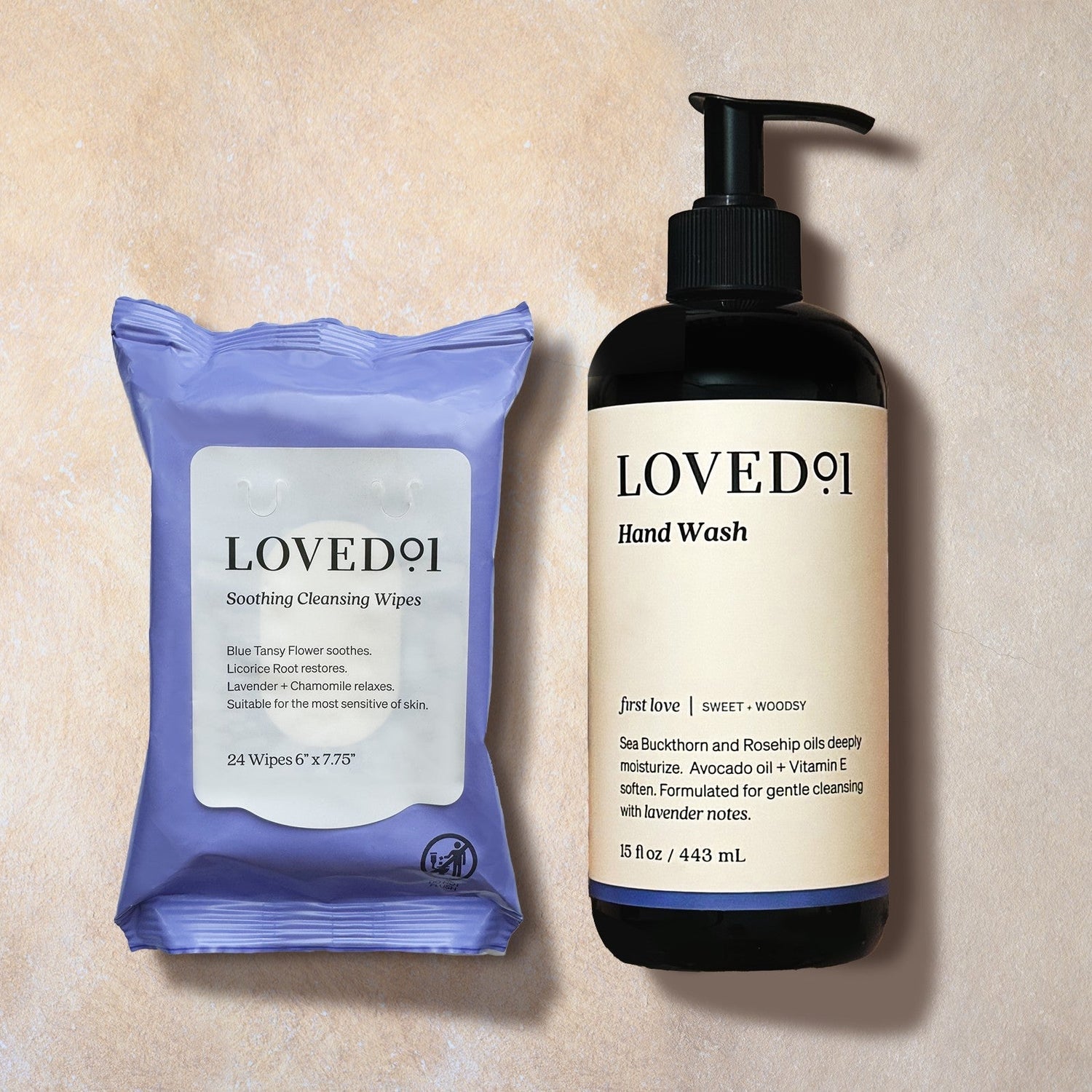 Soothe your senses with the naturally calming power of lavender. The Soothing Cleansing Wipes refresh on the go with plant-based fibers and botanicals like Aloe, Chamomile, and Blue Tansy—lightly infused with lavender to calm skin and spirit. Paired with the First Love Hand Wash, a non-stripping, moisturizing cleanser with a soft natural lavender scent, this duo transforms everyday care into a spa-like ritual. Together, they leave skin refreshed, hands nourished, and your mood lifted with every use.