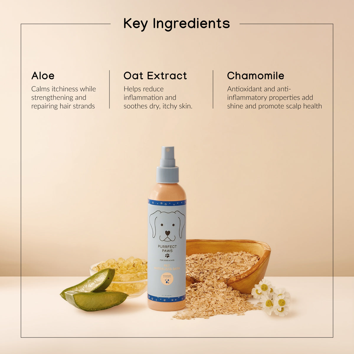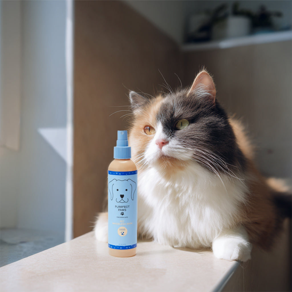 No bath? No problem. Skip the tub and keep your pet clean and fresh between baths with the Purrfect Paws Waterless Shampoo. Our no-rinse formula gently cleanses and conditions with nourishing oat extract and antioxidant-rich vitamins is perfect for sensitive skin, travel, and bath-averse pets. Infused with a Bath & Body Works exclusive scent of fresh raindrops and delicate violets, our waterless shampoo leaves your dog or cat with a shiny, healthy, fresh-smelling coat without the water, mess, and stress.