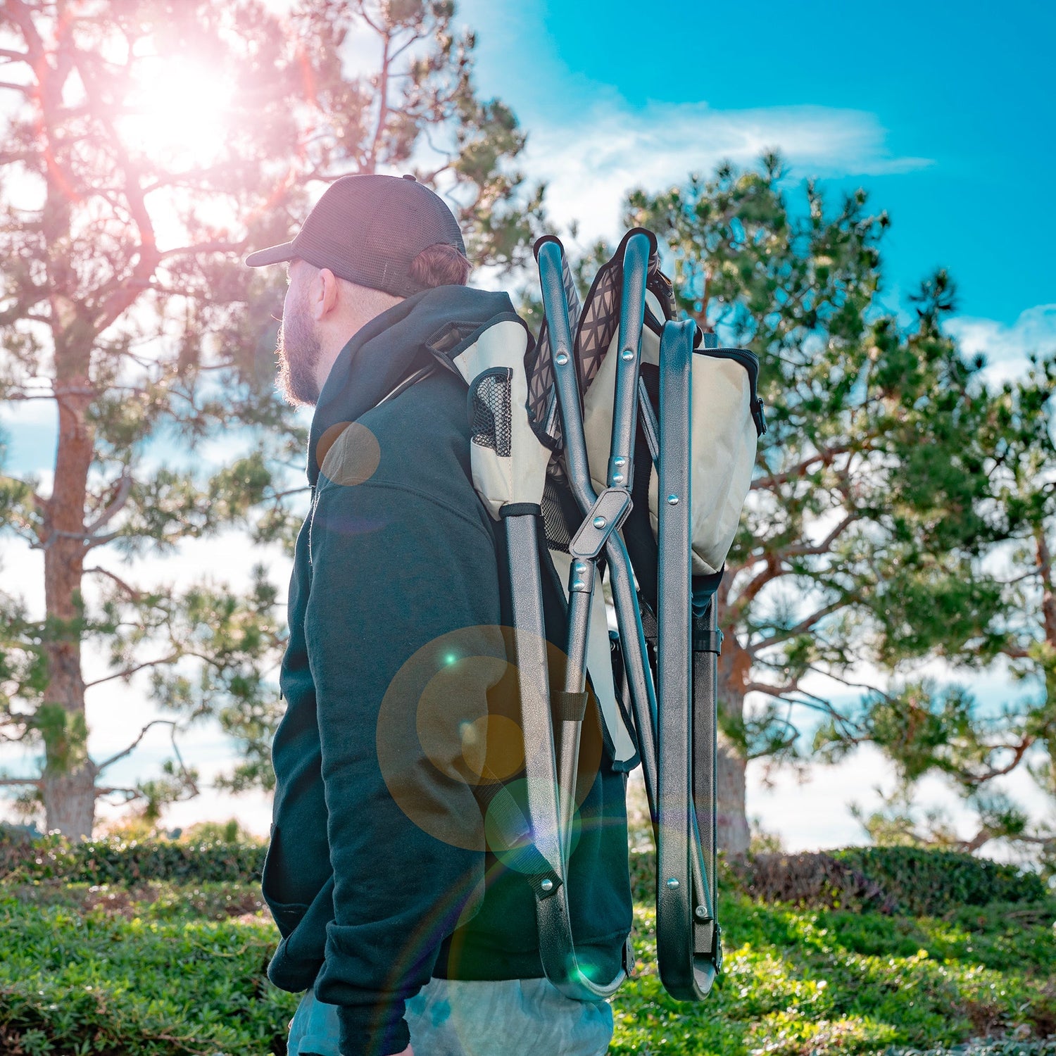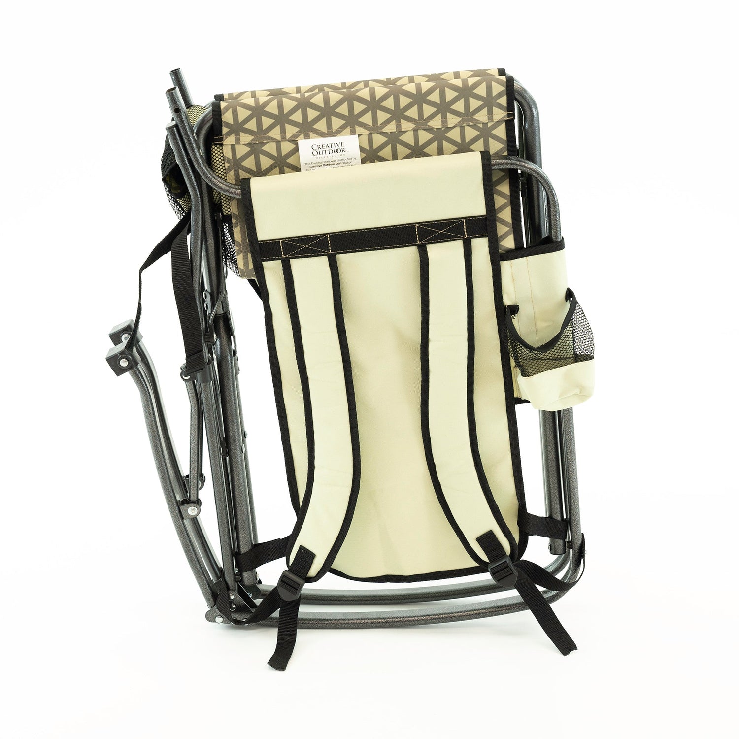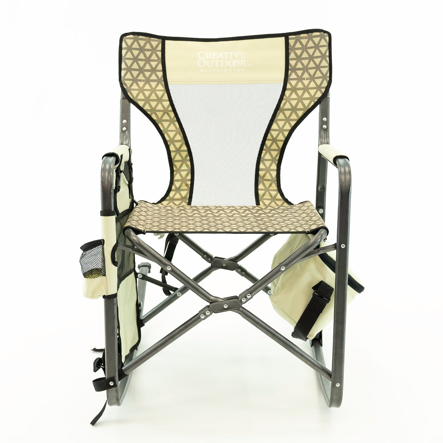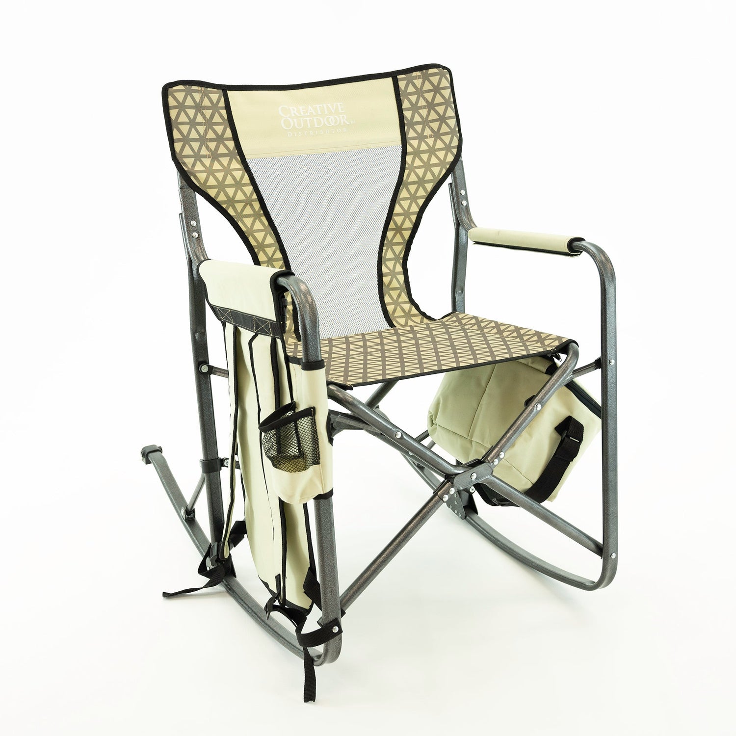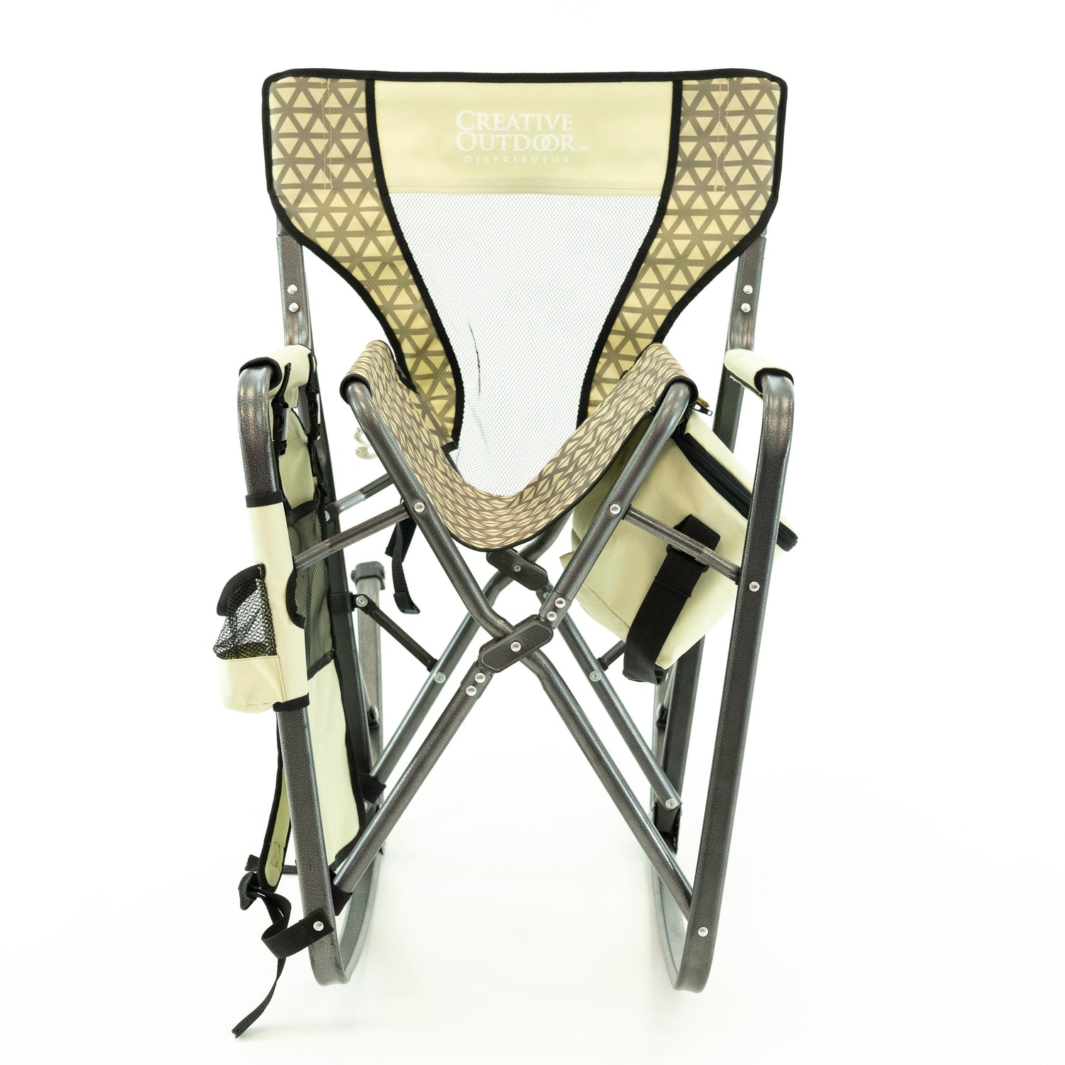Features Include tip resistant rocking, a magazine pocket, water bottle holder, mesh back rest for ventilation, and detachable soft-sided zip top cooler with shoulder strap. To top it all off, this rocking folding chair comes with back pack straps for easy fold up and go carrying.
