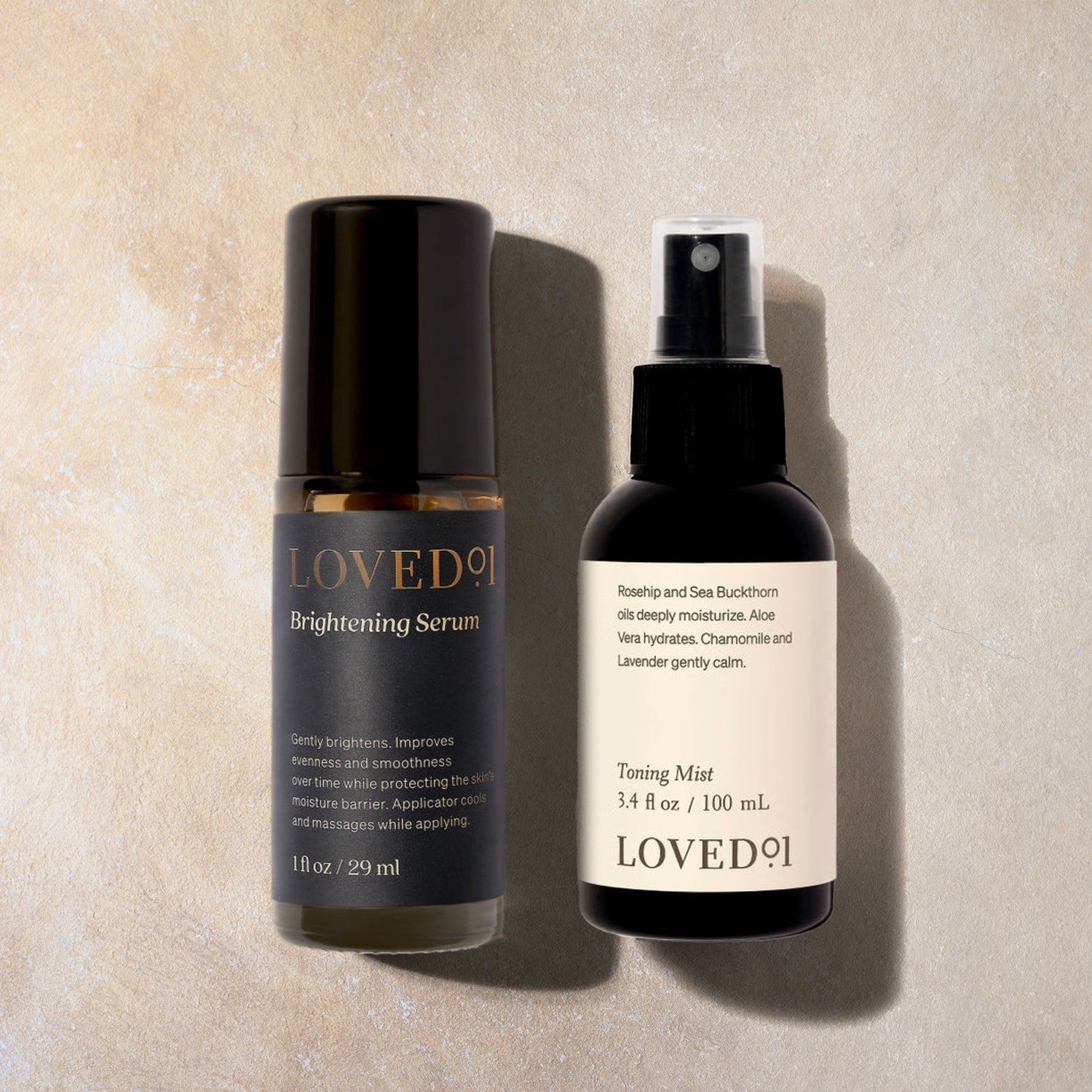 Your daily dose of radiance. The Brightening Serum gently improves skin tone and texture over time with Mandelic Acid, Niacinamide, and Azelaic Acid, while its cooling steel rollerball soothes and depuffs. Paired with the Hydrating Toning Mist, a triple-action boost that calms irritation, tightens pores, and plumps skin for better absorption of every step that follows. Together, this duo hydrates, evens, and delivers an effortless glow—day after day.