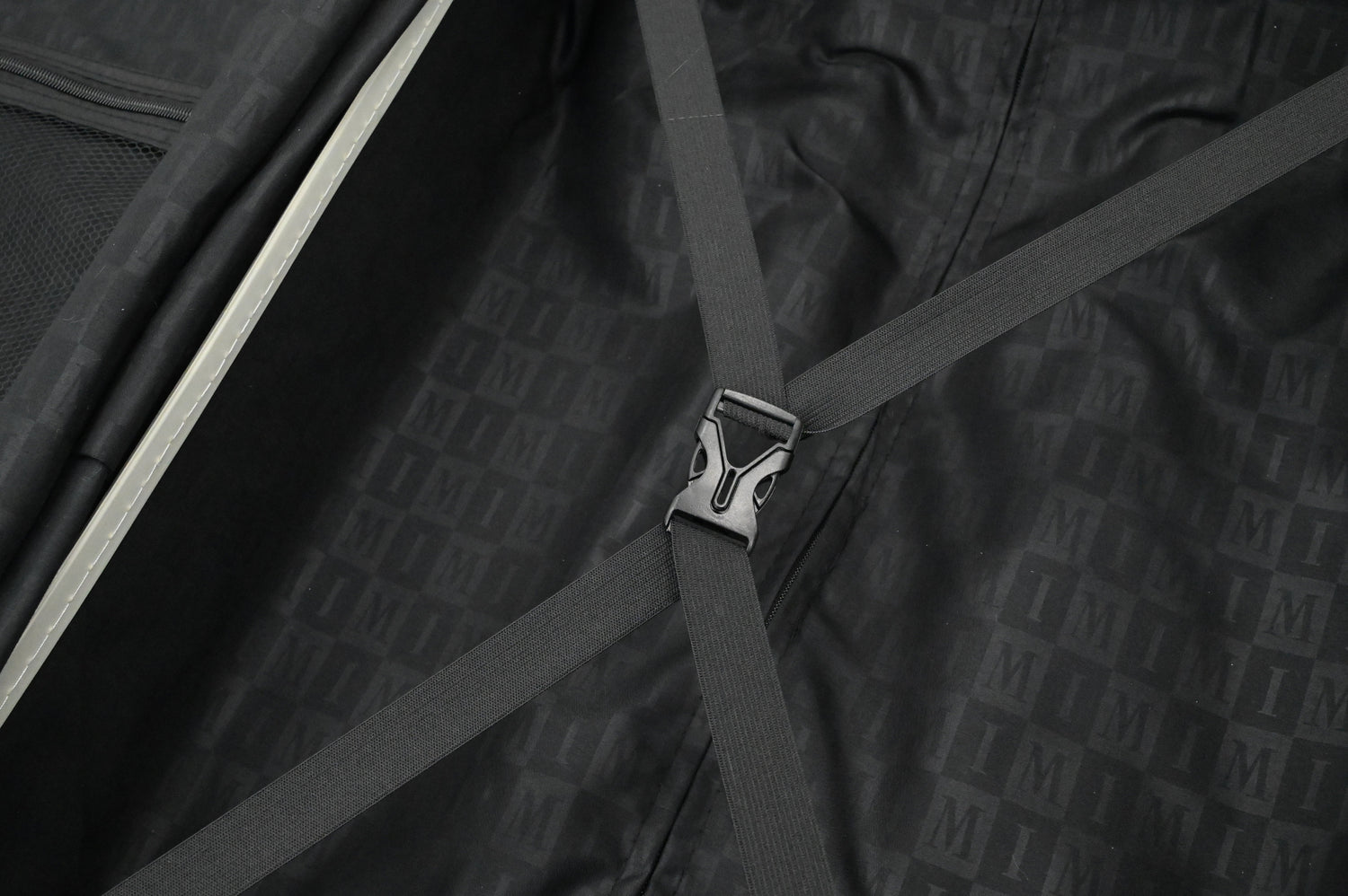 Includes interior mesh lid compartment and elastic cross straps to keep clothing and personal items in place. -