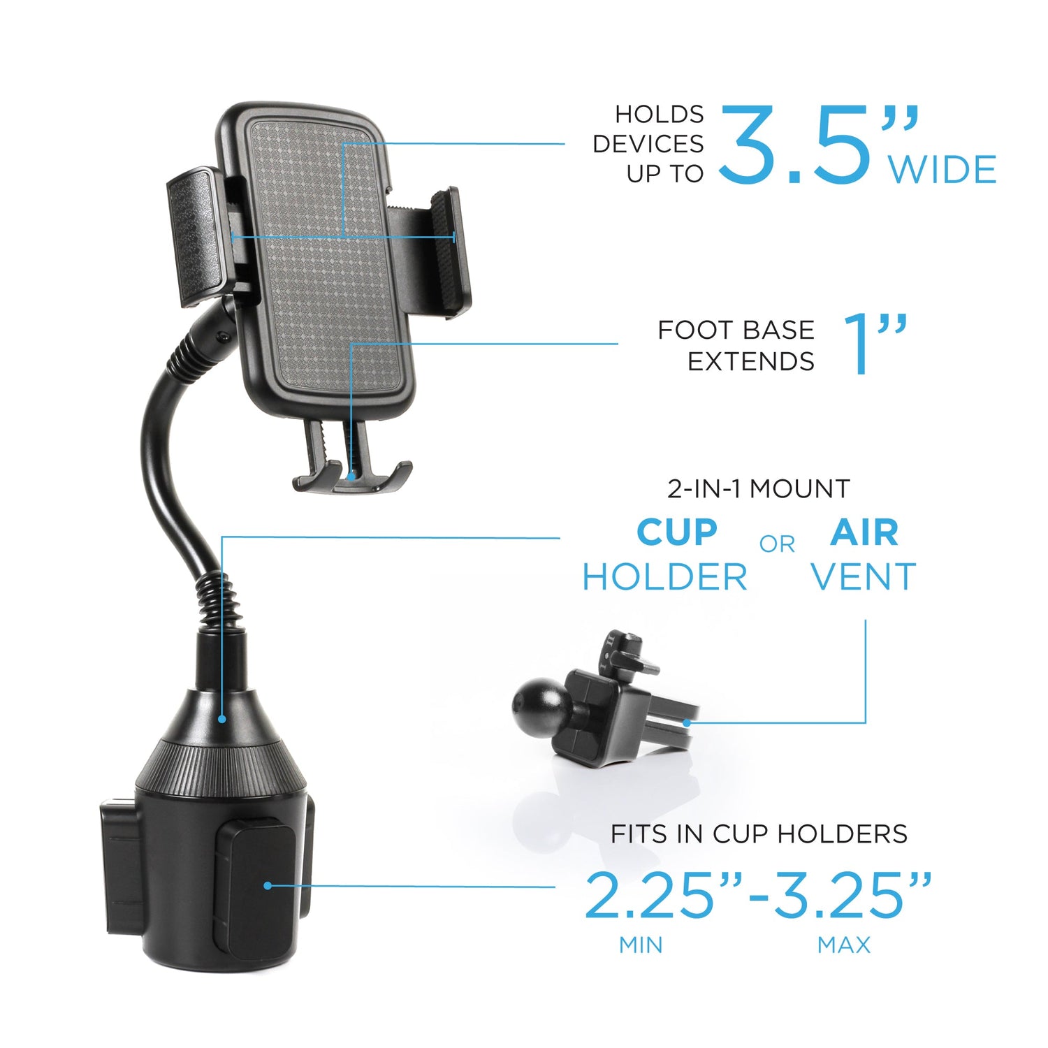 The adjustable base locks into virtually any cup holder, and the arms expand up to 3.5in wide to fit most phone types. The Air Vent Clip creates a 2-in-1 mounting solution and works with vertical and horizontal air vents!