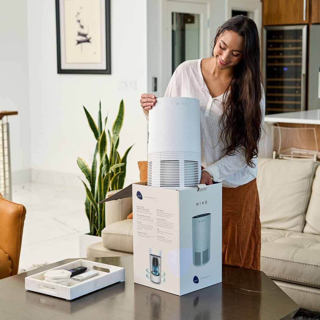 Our newest MIKO Air Purifier is built to perform and is extremely durable. Easily Remove 99.97% Hair, Fur, Dust, Bacteria, Viruses, Mold, Pollen, Allergens, Odor, up to 970 Sqft. The lowest setting operates at 24db to make sure you get a good night's rest and not disturb you while sleeping. Built-in timer to choose how long you would like the air purifier to run for. 4 Fan Speeds to allow for optimal use. Air Quality Sensors can indicate the exact quality and level of the air on your home, office, gym, room, or learning center. Child lock mode can keep any and all members safe and breathing healthy. Easy touch control panel to easily change settings based on your preference. The air goes through a 3 stage filtration process that is composed of a preliminary, Medical Grade H13 HEPA Filter, Active Carbon Filter. Our filter is extremely large to be most effective during the purifying process and can last between up to 8 Months.