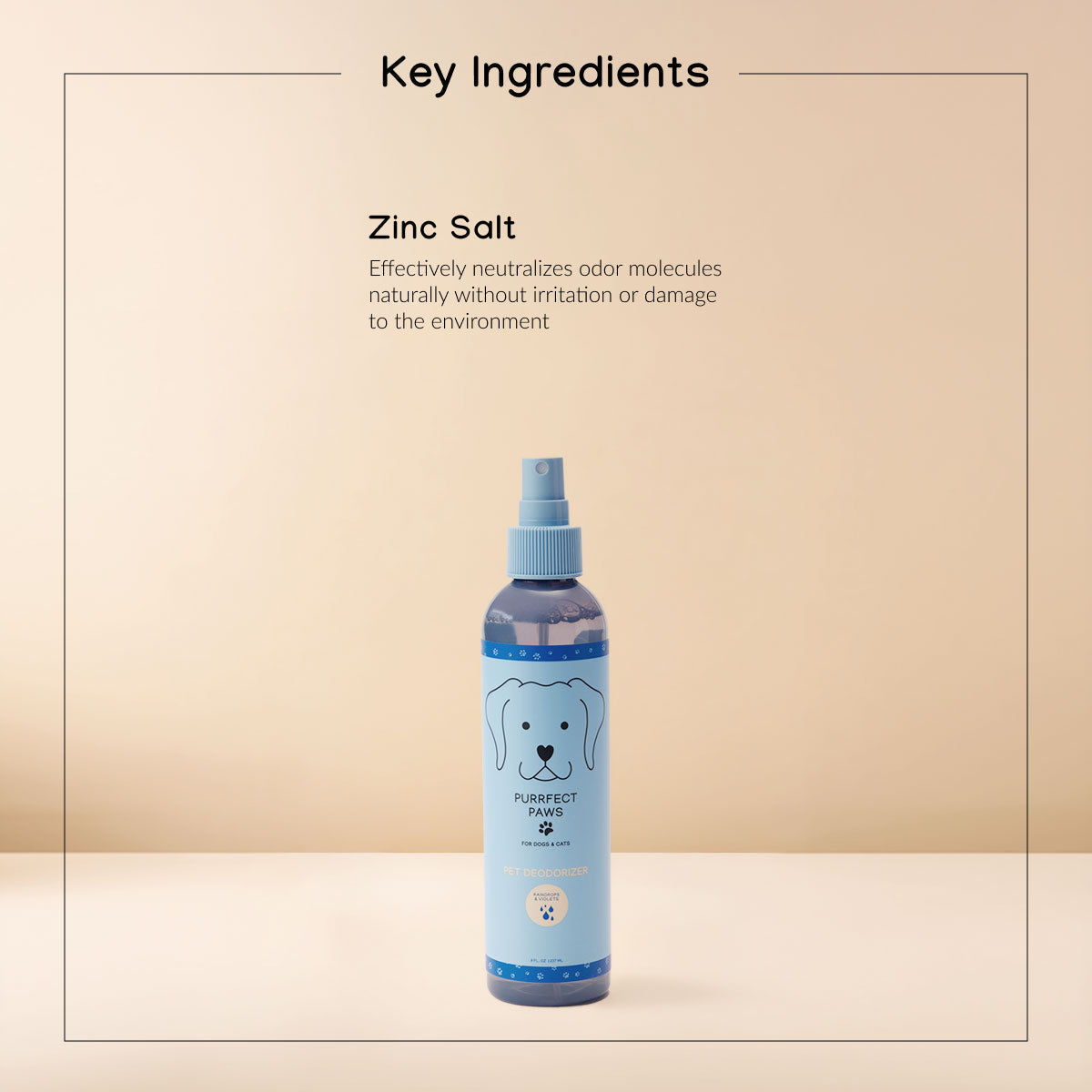 With this versatile deodorizer by Purrfect Paws, pet-safe freshness is just a spray away. Zinc salt naturally eliminates even the toughest odors at the source while our exclusive Raindrops & Violets scent by Bath & Body Works leaves your space smelling like a dew-covered meadow. The clean, dye-free formula leaves no sticky residues or messes behind, making this deodorizer perfect for refreshing sofas, beds, rugs, and the air around even the most sensitive pets (and humans).