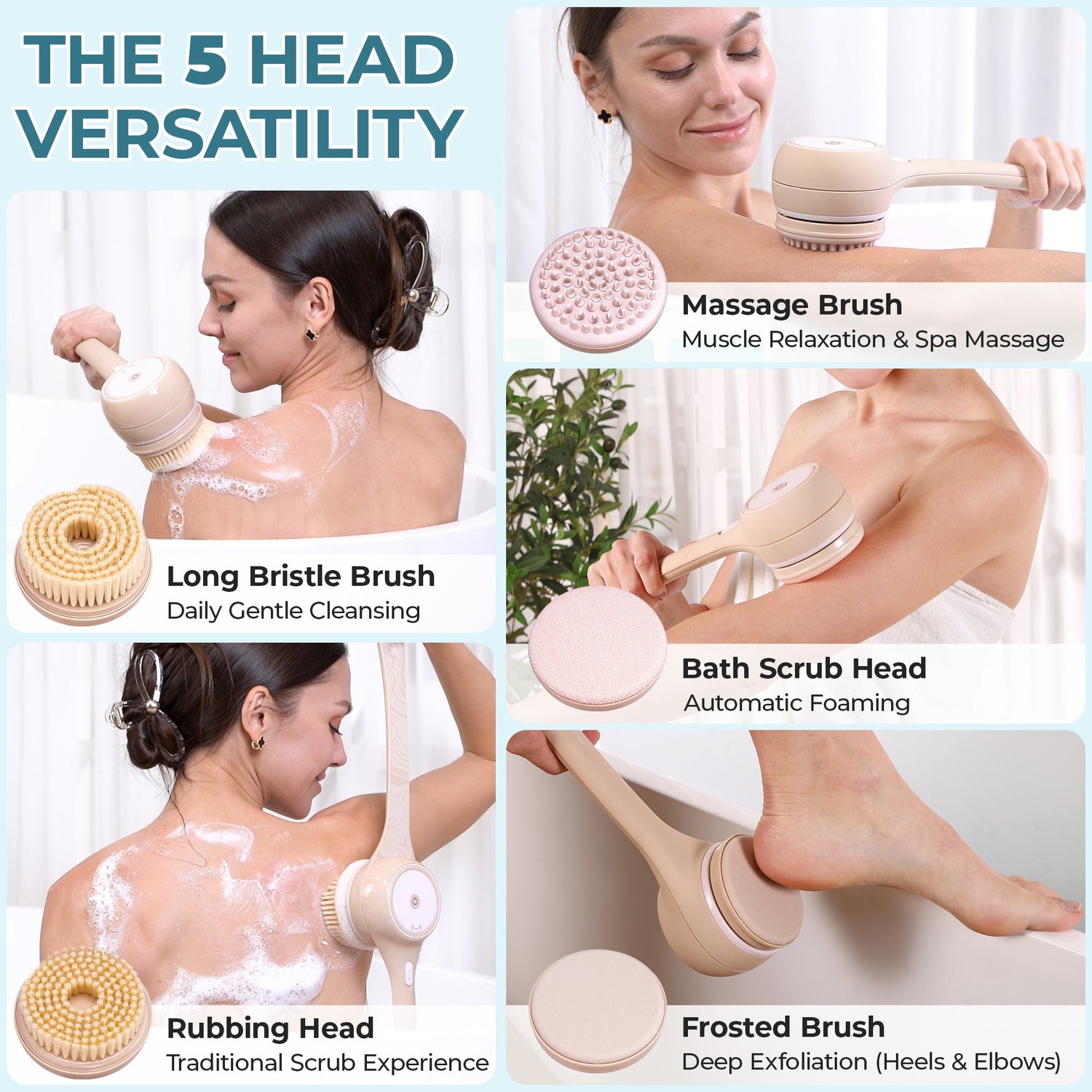 5 Interchangeable Brush Heads – Designed for body cleansing, exfoliation, massage, and hard-to-reach areas